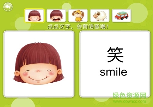 1)字词学习、复习模块:动画丰富的图文卡片,让幼儿认知事物,学习字词。