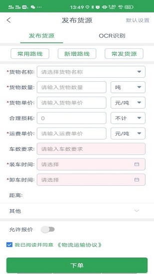 1、进入app以后就能在这里开始填写对应的货源订单了
