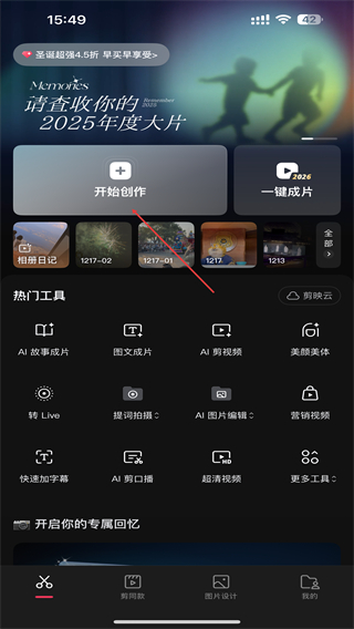 1、打开剪映的应用软件后,点击界面的开始创作的按钮。