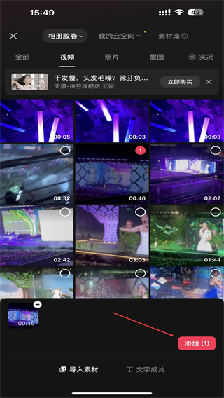 2、在相册中选中目标视频,点击右下角添加,进入视频编辑页面。