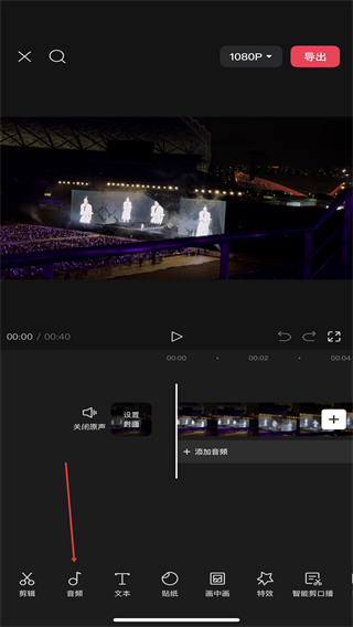 3、在编辑页面底部的工具栏中,点击音频选项,展开音频操作菜单。