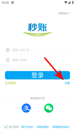 1、打开秒账APP,在登录界面点击注册,进入新用户注册页面。