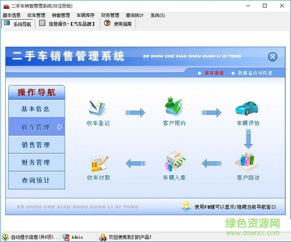 收车管理:收车登记、客户预约、车辆评估、客户回访、车辆入库、收车付款。