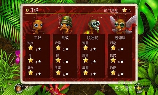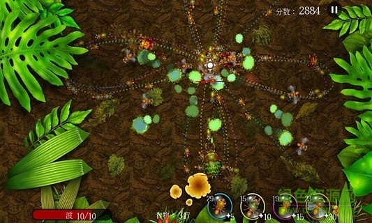 在游戏里,蚂蚁的分工十分明确:工蚁负责劳作,兵蚁负责战斗,远程打击的喷吐蚁,空中力量轰炸蚁。与一般的塔防游戏不同,这款游戏拥有非常大的自由度,玩家既可以选择主动出击,让拥有作战能力的蚂蚁倾巢出动消灭敌人,也可以用保守的防御,聚拢在蚁穴周围,一面将虫虫化成蚂蚁军团的粮食,一面保卫家园。玩家在保卫自己的领土的过程还要不断探索地图,寻找各种宝石已取得额外分数。
