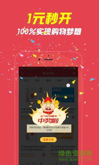 一元秒开手机客户端是一款专注于一元夺宝众筹购买商品的应用平台,海量商品等你来抢购,让你分分钟享受到夺宝的乐趣,分分钟把自己的心仪的商品拿回家。还在等什么,快快来绿色资源网下载体验起来吧!