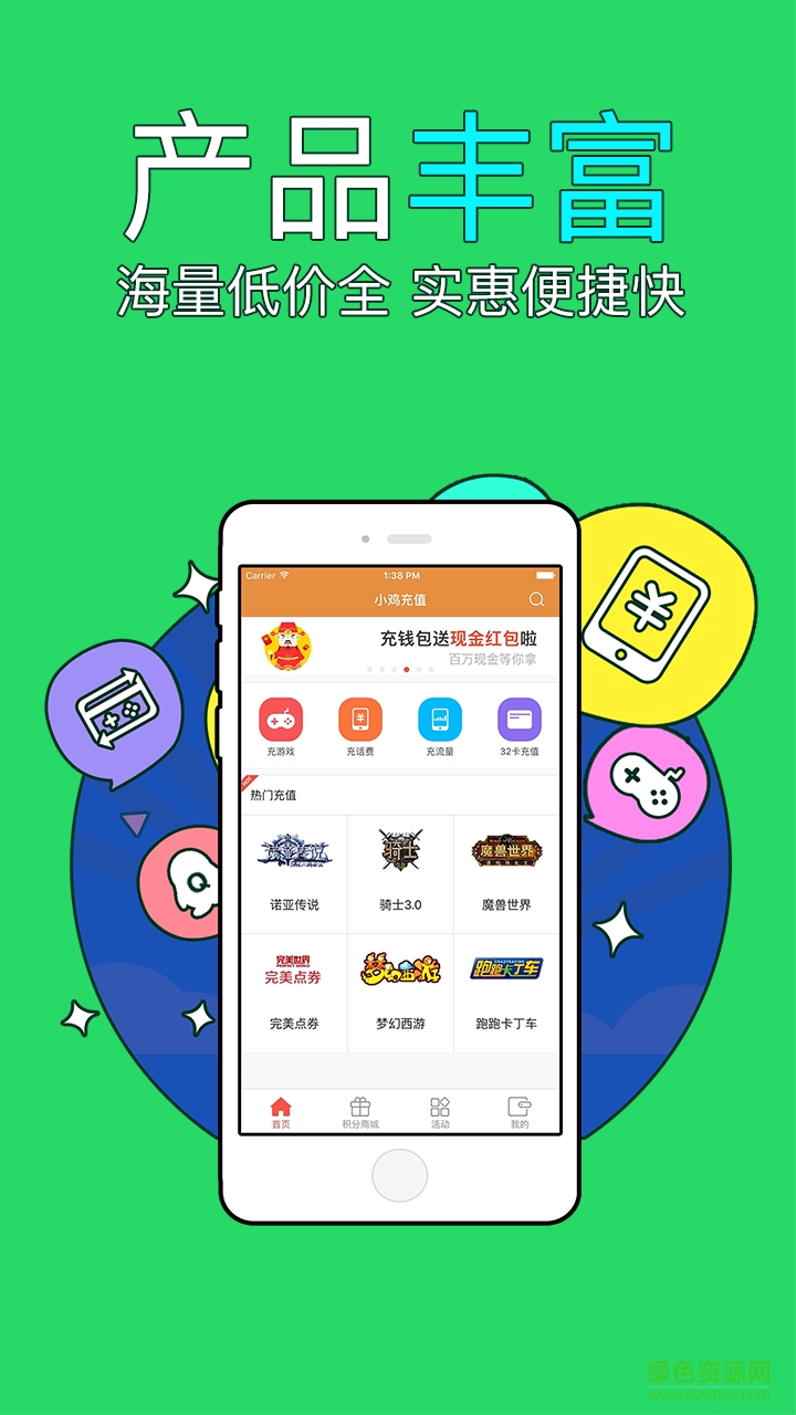 1、充值产品:话费、流量、视频会员、各类游戏。