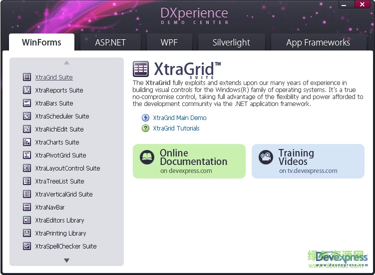 DXperience Universal Subscription 是一个.NET 平台的用户界面套装,它包含Grid、Chart、 Reporting、Tree-Grid等100多个功能子控件,同时套包内包含Winfrom、WPF、Sliverlight、Asp.net 版本和 .NET Application Framework 开发框架。