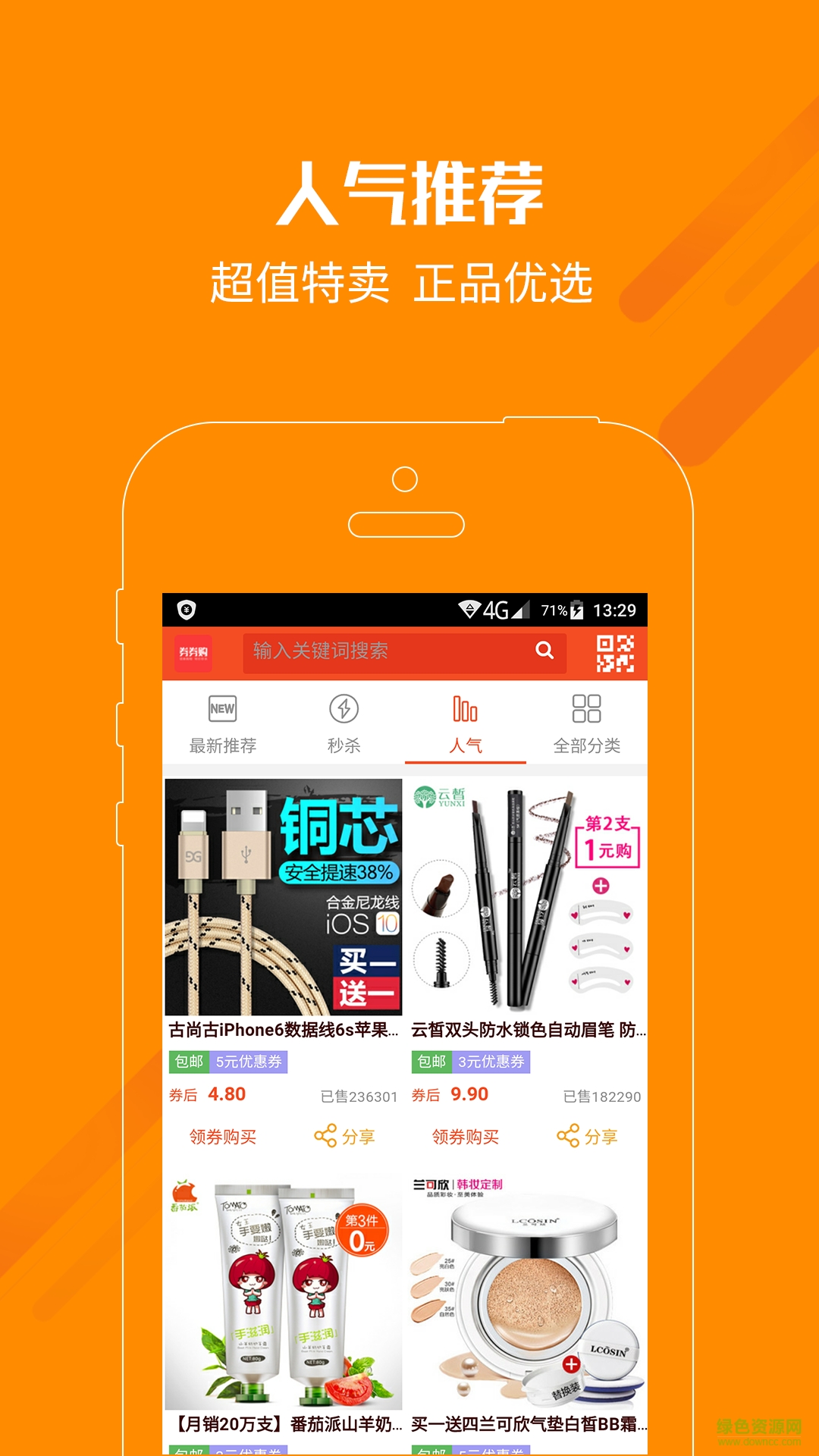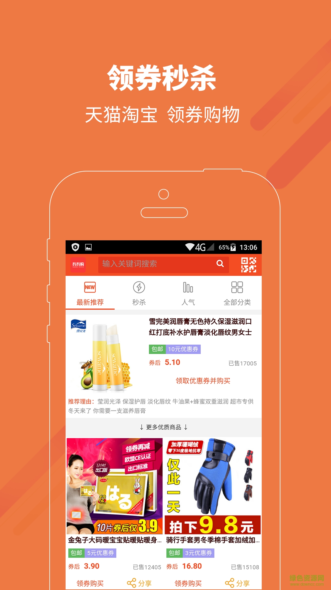 券券购手机版是一款专注于网络购物的软件,平台会给用户提供各大购物网站的优惠券,让用户购物变得更优惠更贴心。用超低的价格就可以买到超优质的商品,是不是很划算呢。有需要的朋友赶快来绿色资源网下载吧。