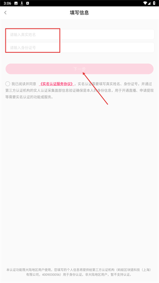 3、依次输入真实姓名、身份证号码等个人信息,再点击下一步即可。
