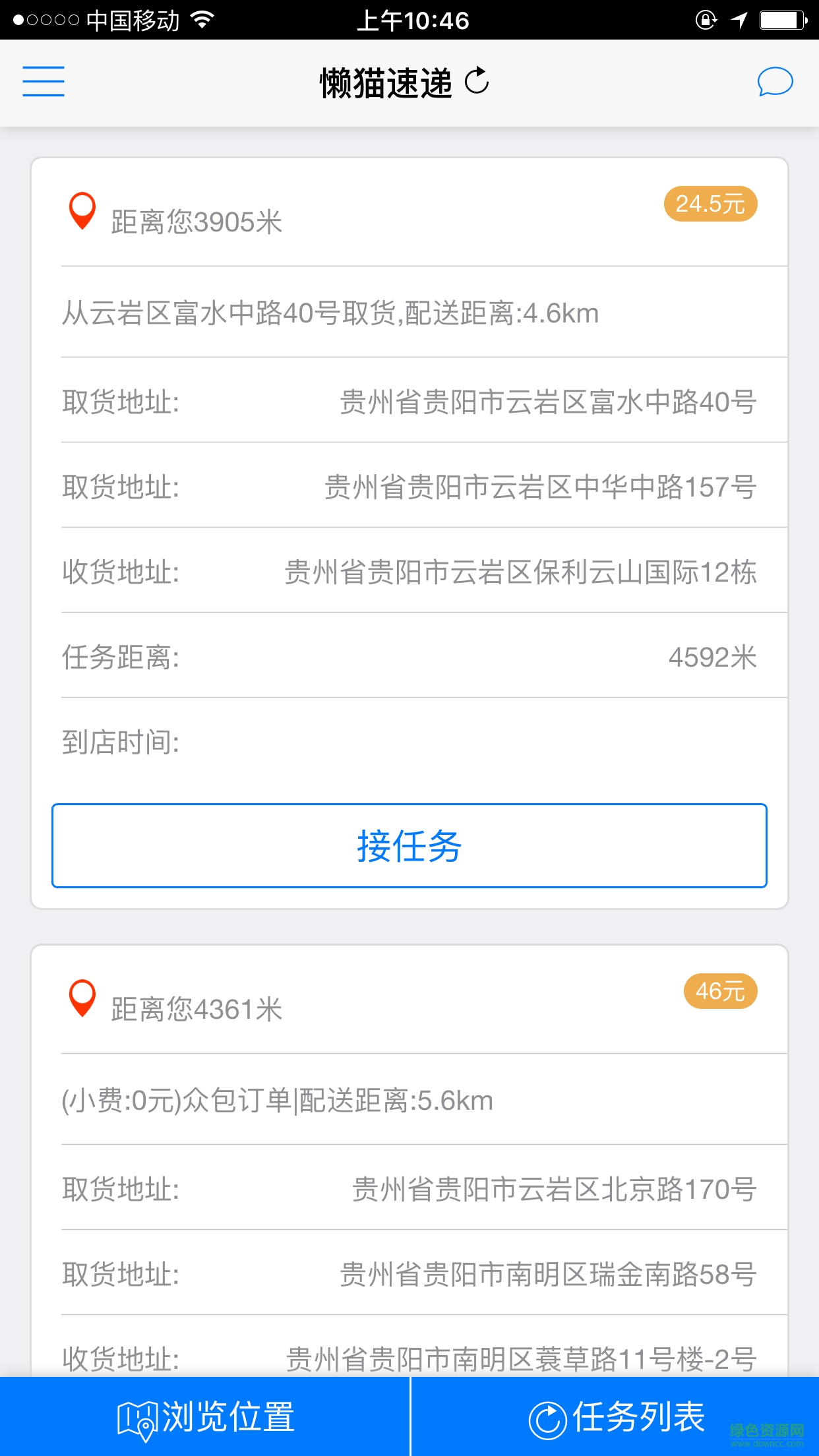 同城跑腿联盟【贵阳】使用的众包任务调度工具; 应用基于LBS定位就近展示附近配送任务,您可以通过登记认证来兼职从事同城配送任务;在分享经济的大潮中,您会感受到懒猫速递带来的便利。
