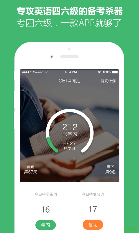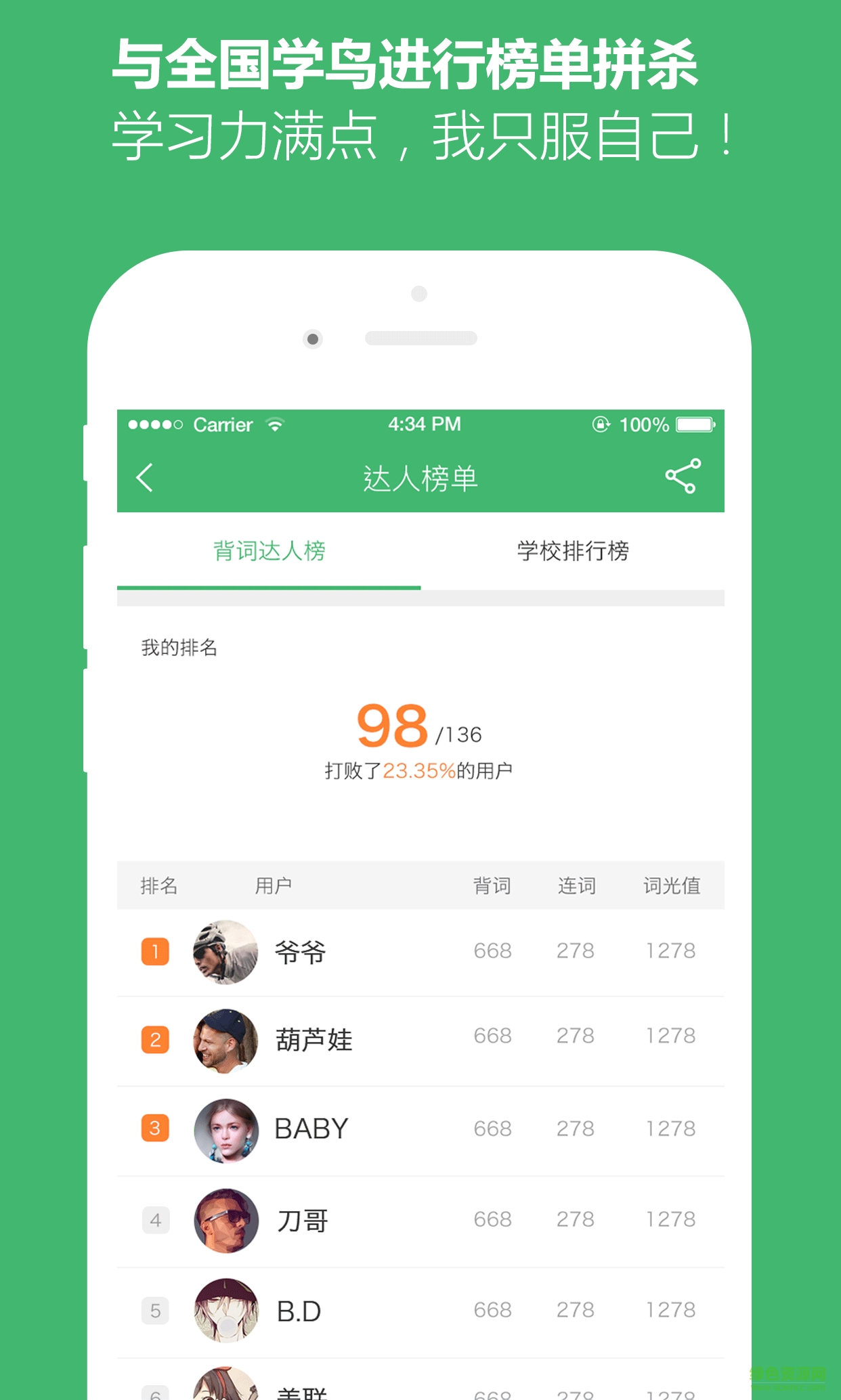 您在APP所获得的英语四级/英语六级的词汇量与能力值,将与全国/本校同学们进行达人榜单PK,备考不孤单,变身学霸! 来英语考级帮,通关英语四级&英语六级 so easy!