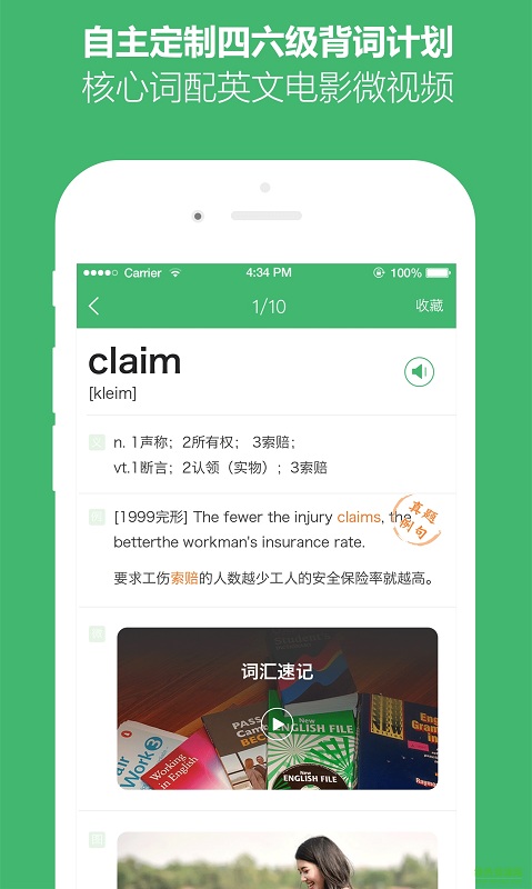 英语考级帮,英语四级和英语六级的背单词学英语备考App! 专业、简约、实用!核心词汇匹配英文电影视频选段! 考四六级,一款app就够了!