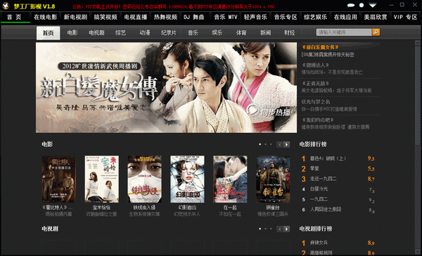 梦工厂影视是一款网络视频播放软件,囊括主流网络音乐站点、影视、随心听、随心看!集电视直播,在线电影,在线音乐等功能,绿色版,不需要安装,收集网络上几百上千个电视直播频道,少部分杀毒软件可能误报,请添加信任。
