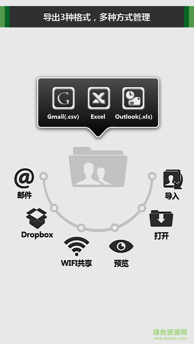 ——支持通过wifi共享通讯录文件至电脑 *支持Email,Dropbox等多种方式备份、共享联系人 编辑管理
