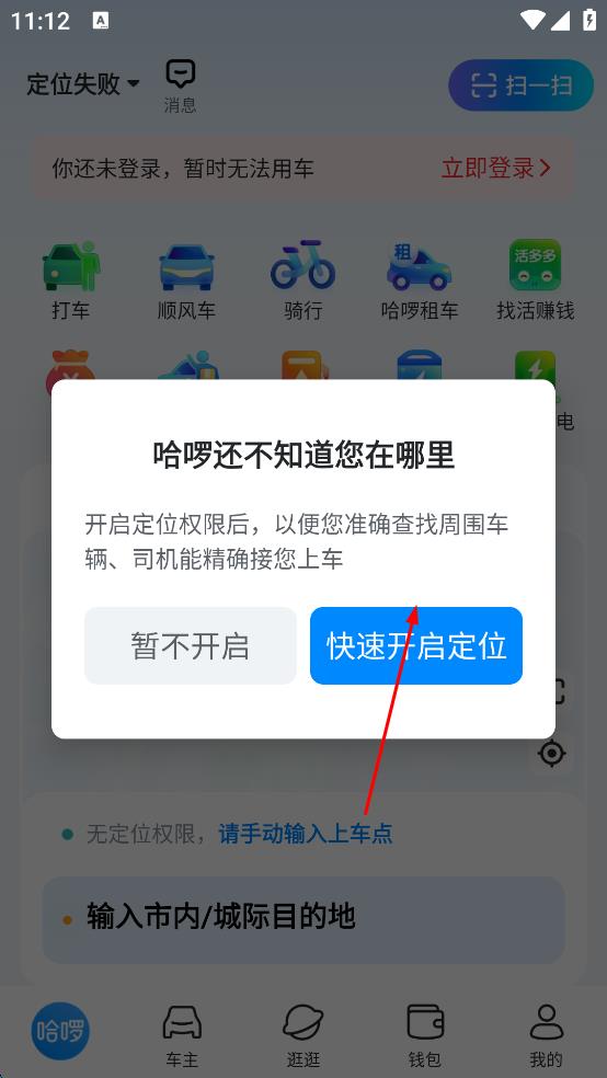 2、若定位失败,会弹出哈啰还不知道您在哪里提示框,点击快速开启定位按钮,开启定位权限以便准确查找周围车辆。
