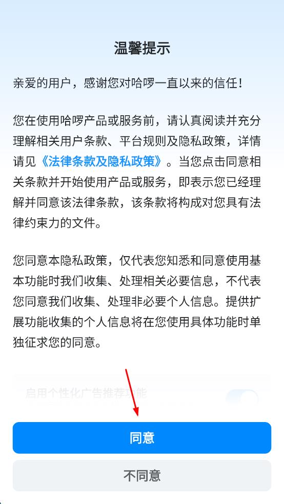 1、打开哈啰应用,出现温馨提示界面,点击同意按钮,确认相关用户条款、平台规则及隐私政策,进入应用主界面。