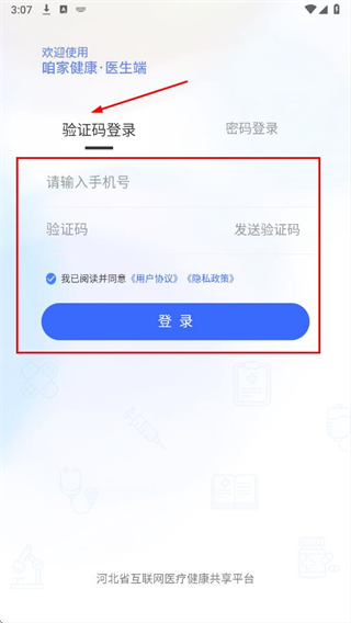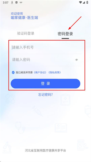 1、打开咱家健康医生端APP,选择密码登录方式,输入手机号和密码,勾选用户协议,点击登录。