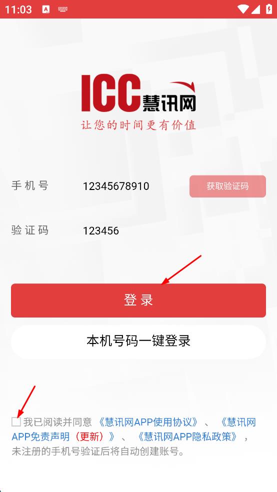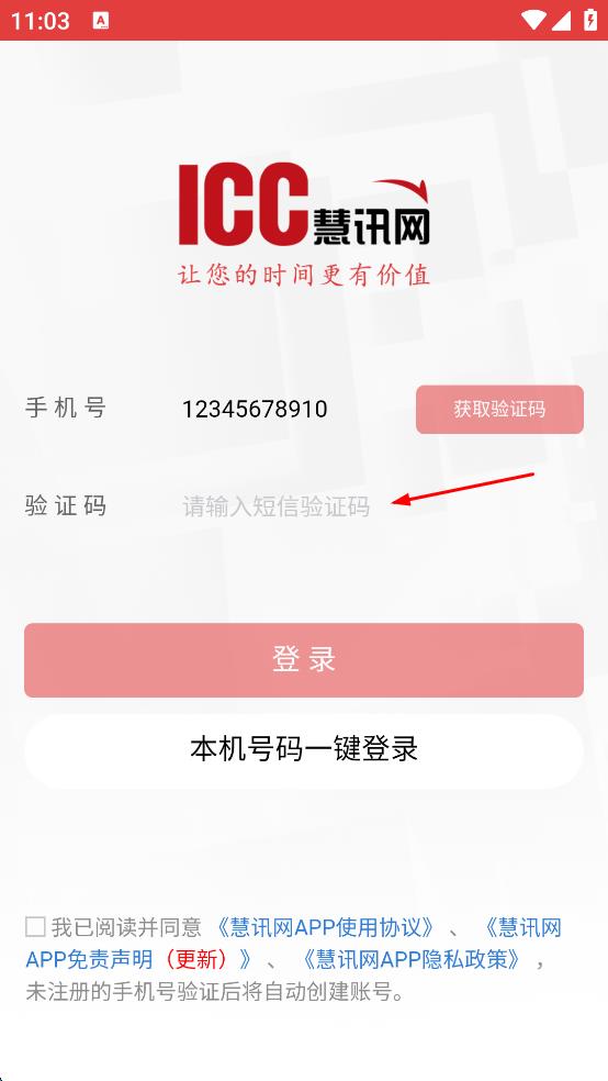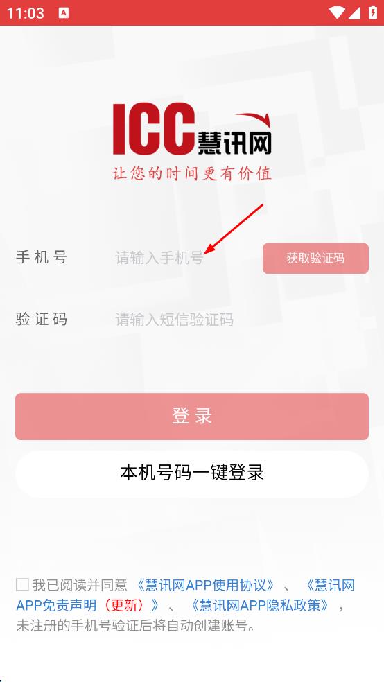 1、打开ICC慧讯网软件,进入登录页面后,在手机号输入框中输入手机号码,点击“获取验证码”。