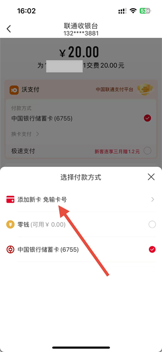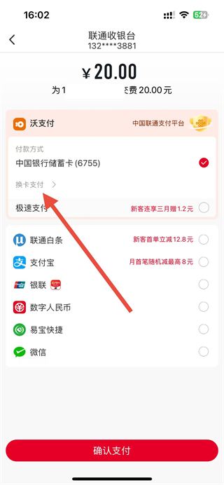3、在联通收银台页面,找到当前选中的付款方式区域,点击换卡支付选项,打开付款方式选择弹窗。