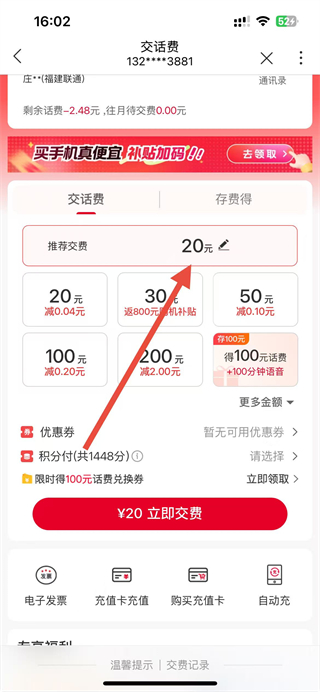2、在交话费页面选择目标缴费金额后,点击对应金额的立即交费按钮。