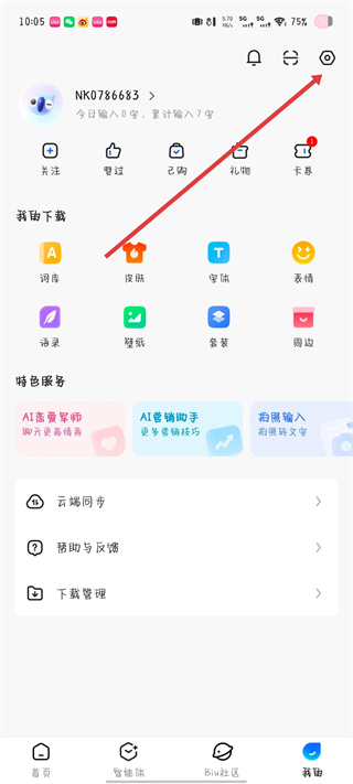 1、打开讯飞输入法,进入个人页面,再点击设置图标,进入设置界面。