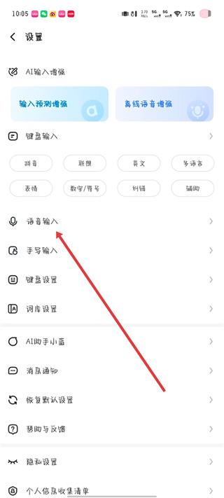 2、在设置页面中,找到语音输入选项并点击,进入语音输入设置界面。