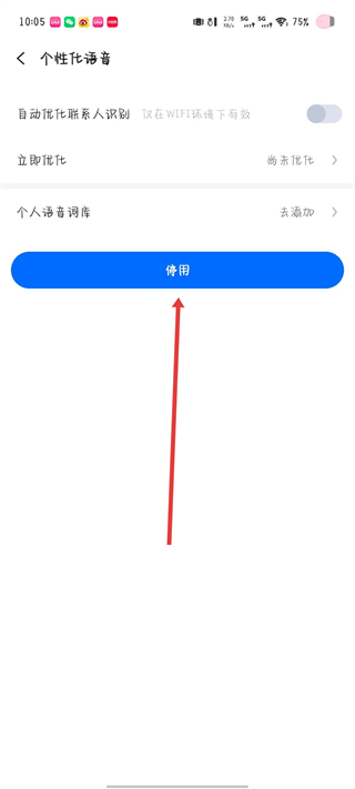 4、在个性化语音页面,点击蓝色的停用按钮,即可关闭个性化语音功能。