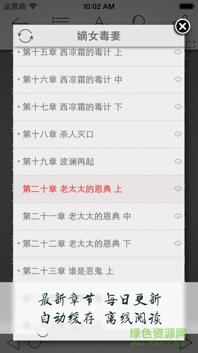 非高峰时段(19-23点以外)在联网状态进行阅读时,本应用会自动连续预载以后的章节,每次下载间隔为10秒。您只需要持续在线阅读约5分钟后,便可以在地铁中或者网络无法到达的地方离线阅读以后的约30章节的内容。