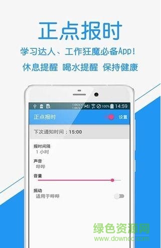 ——《正点报时》可以在每隔1小时,振动响铃提醒您休息喝水,在学习、工作之余还能保证您的身体健康!