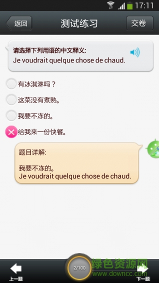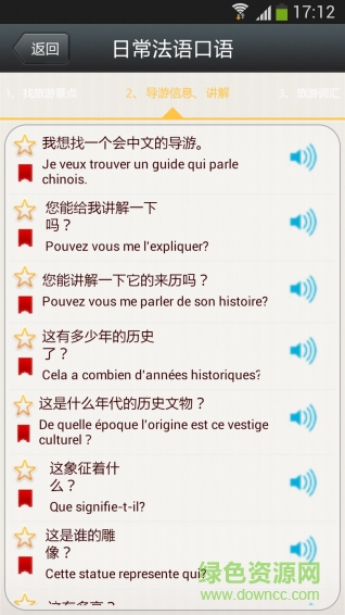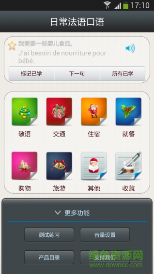 日常法语口语是一款专门用于日常法语口语学习的教育学习应用app.就是打破大家闭口学英语的方式,适合法语基础入门,让对法语感兴趣的朋友开口说英语,该软件不仅有日常的法语发音学习,还有测试练习,让你不断的测试自己的法语学习水平。提高自己的法语口语能力。离线就可以学习哦!需要的朋友赶紧来绿色资源网下载体验吧!