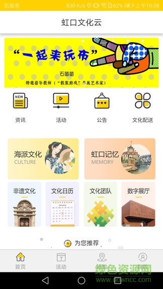 虹口文化云app是针对该地区设计的一款文化资源服务平台,最新资讯实时更新,超多城市文化动态全面查看,活动列表详细形式,线上配送方便快捷,支持在线参与讲坛活动,欢迎来绿色资源网下载!