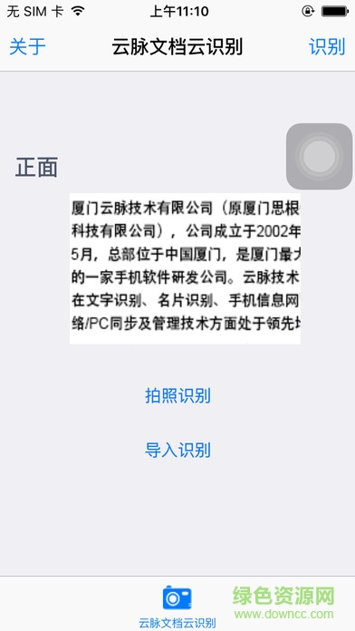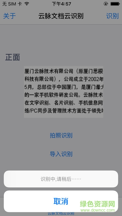 云脉文档云识别应用软件是云脉科技公司提供的光学字符识别技术(OCR)演示软件,手机端提交要识别的内容,云端服务器执行识别任务,并迅速返回识别结果。用户可以用这个手机应用软件体验云脉光学识别技术在文档识别中的应用。