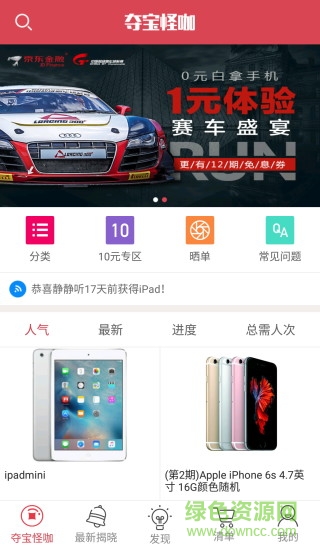 夺宝怪咖app是一款专注于手机购物的软件,主要是以一元购的形式购物。只需一元用户就可以抢得高价商品,精彩刺激的购物形式,想不想参加,还在等什么,快来绿色资源网下载吧。
