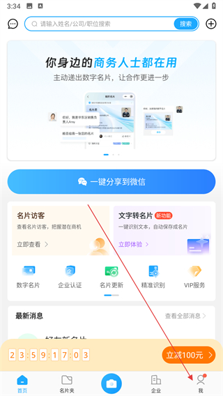 1、打开名片全能王软件,点击界面下方的我选项进入个人中心页面。