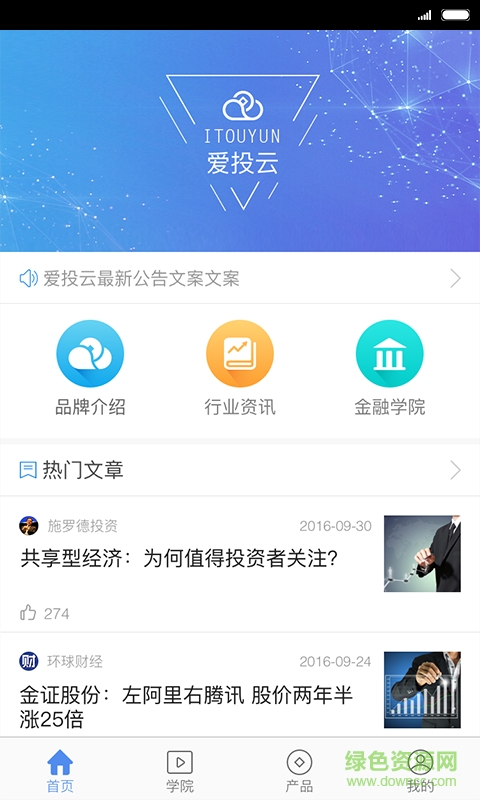 爱投云是基于领先的金融科技水平,以向用户提供金融咨询、金融教育为核心功能的金融生态平台.通过高质量的内容选择,增强用户选择投资机会、识别金融风险的能力. 在行业资讯版块,爱投云锁定金融投资领域,将咨询视野拓展至全球,将同步发布海内外主要金融市场的动态信息和大事件.在金融学院版块,爱投云结合诺信集团金融研究成果,以视频课程、行业报告、案例专业分析等成果,进行体系化的投资者教育. 此外,爱投云后期版本将搭建工作管理系统,为有需求的企业进行支持,实现工作内容的线上、线下联动.不仅能够起到提高部门的管理效率的作用,也为更科学和量化的绩效考核机制提供依据.
