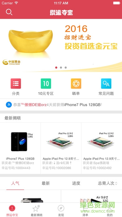 攒运夺宝iPhone版是一款专注于手机购物的软件,这里有海量的商品供用户选择,与普通的购物软件不同的是浙款软甲是以一元夺宝的形式进行购物,谁的运气好谁就可以拿走最热门的商品,苹果手机、苹果电脑等都有可能一元钱买到哦,是不是很划。赶快来绿色资源网下载使用吧。