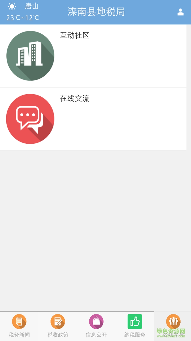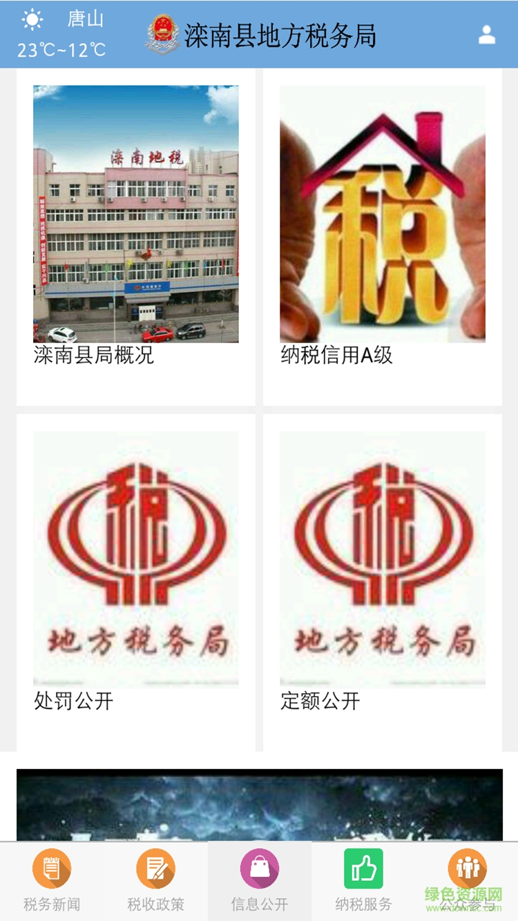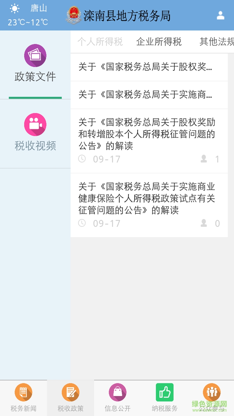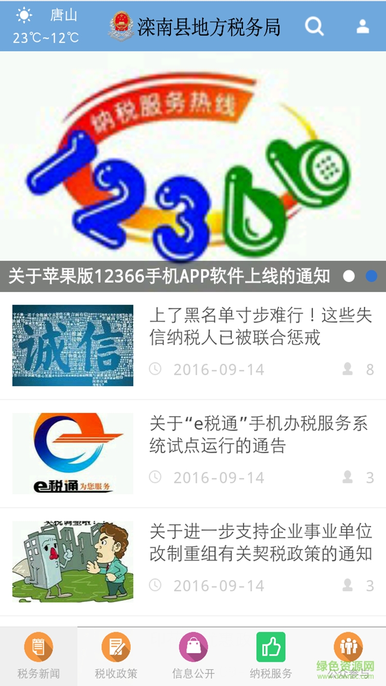 滦南县地税局App设置税务新闻,税收政策,信息公开,纳税服务,公众参与5大板块。