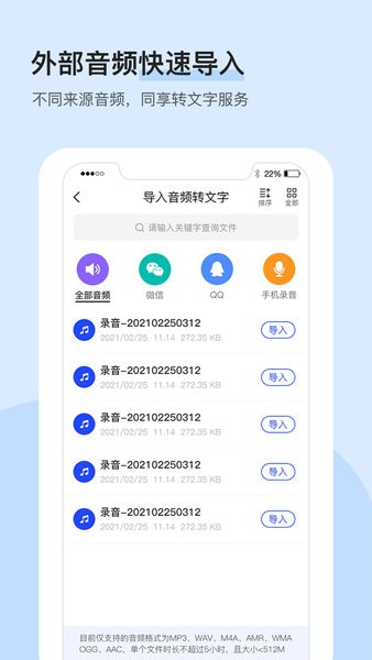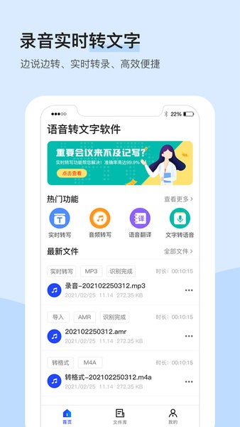 集专业录音、录音转文字、实时语音翻译、远程视频会议等功能为一体的手机应用软件,将手机变成“智能录音笔”,可满足日常办公会议、授课演讲、媒体采访、心得写作等多场景下的录音转文字的需求,全面提升办公效率。