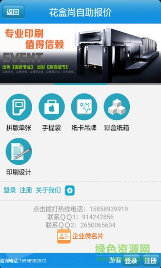 花盒尚软件是一款非常好用的包装印刷服务手机软件,支持在手机上进行手提袋、纸卡吊牌、彩盒纸箱等印刷服务,可以发布自己的报价,欢迎喜爱的朋友到绿色资源网下载体验!