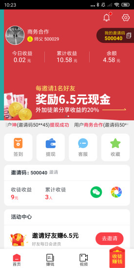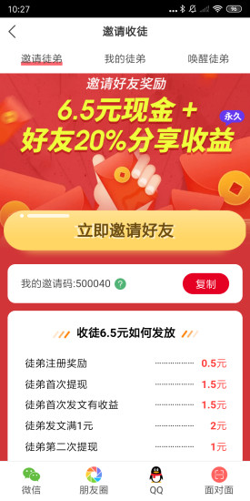 邀请好友6.5元奖励起,稳拿分成20%永久收益,逆天收徒攻略坐收徒弟进贡