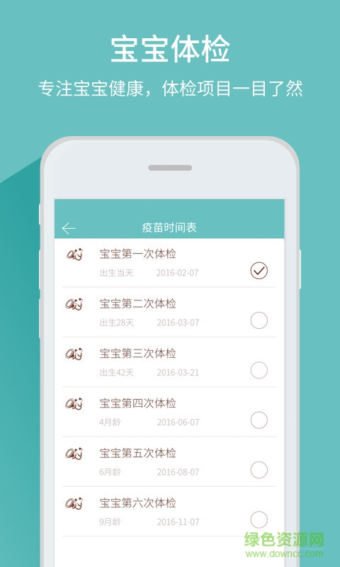 根据宝宝的年龄自动提醒该体检的时间和种类。