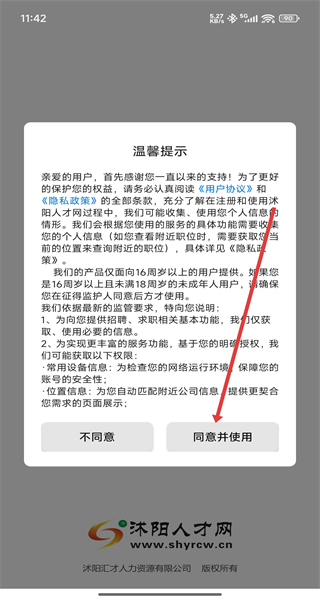 1、打开沭阳人才网APP,点击同意并使用按钮,确认用户协议和隐私政策,进入登录界面。