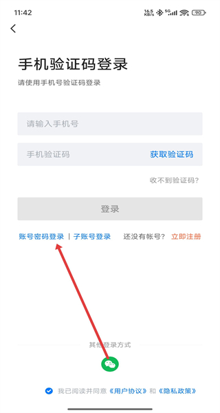 2、在登录界面,点击账号密码登录选项,进入密码登录界面。