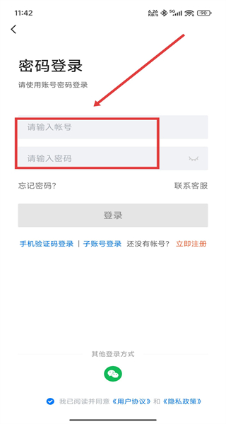 3、在进入密码登录界面后,可以点击输入框依次填写账号和密码信息。