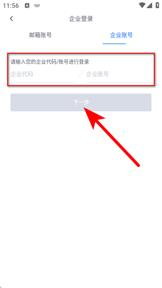 3、在输入框中输入企业代码和账号,点击下一步按照提示完成登录。