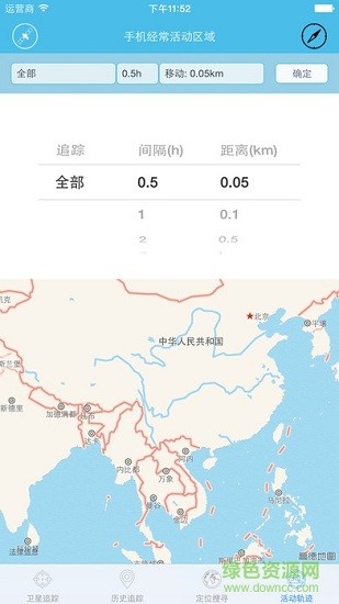 5,活动圈子,系统会根据不同的条件来显示目标长时间停留的地点;追踪轨迹可以选择全部轨迹和自定义轨迹;时间间隔可以选择半小时、1小时、2小时、4小时、8小时移动的距离可以选择系统提供的数值,你也可以自己输入数值;