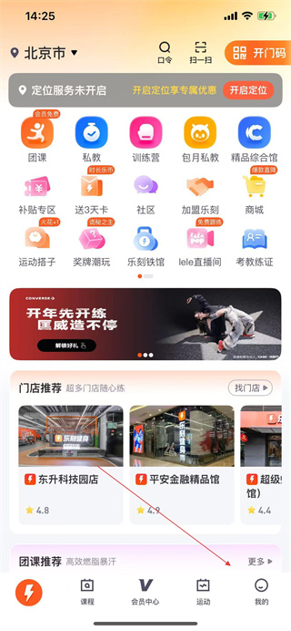 1、首页定位调整到城市范围,可以快速查看离自己最近的门店、可约团课及推荐的教练
