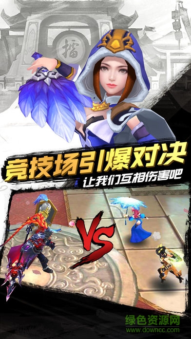 战斗玩法:3D即时动作卡牌,风骚走位、技能打断、风雷水火合体技,绚丽特效,大招秒杀,超强打击快感,挑战极限操作
