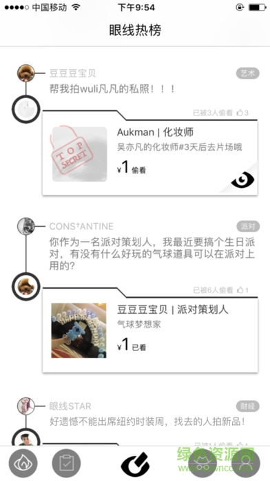 找到具备成为你眼线的人,并向TA付费成为你的眼线,根据你的要求完成拍摄的眼线任务;任何人都可以开通自己的眼线页面,设置自己作为一名眼线的报酬,分享在社交平台中,接受他人的任务.赚钱的同时传播你独特的所见;也许你的需求不知道指定谁来完成,发布你的眼线需求,众人报名,挑选你自己的眼线或者眼线们;你的需求够特别,眼线内容够吸睛,任务完成后,可以展现在热门眼线中,吸引更多人花1元钱"偷看"眼线内容,需求者和眼线平分收入,葛优躺、等钱赚.