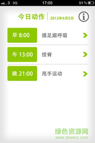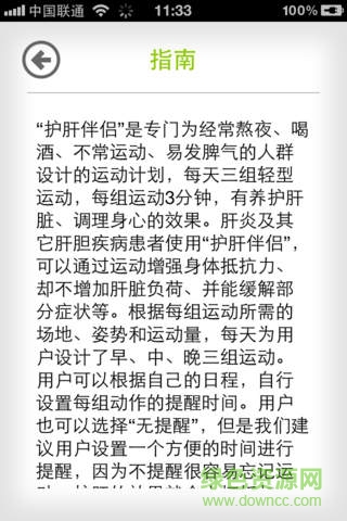 根据每组运动所需的场地、姿势和运动量, 每天为用户设计了早、中、晚三组运动.用户可以根据自己的日程, 自行设置每组动作的提醒时间.用户也可以选择"无提醒", 但是我们建议用户设置一个方便的时间进行提醒, 因为不提醒很容易忘记运动, 护肝的效果就会大打折扣.